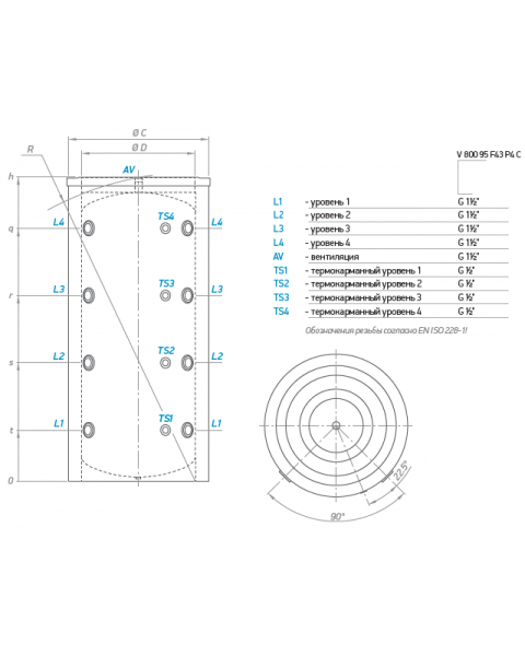 Буферная ёмкость Tesy V 800 95 - объем бака 1000 литров с внутренним баком из стали без покрытия, внешним термометром, высокоэффективной теплоизоляцией из пенополиуретана толщиной 80 мм.