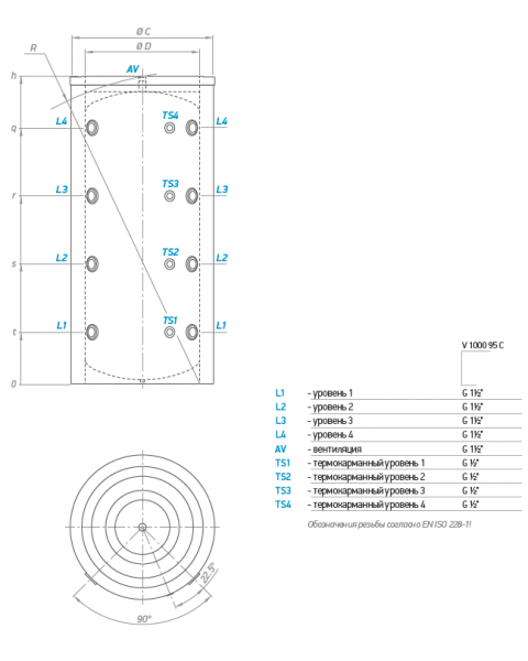 Установка теплоаккумулятора подразумевается угловая, так как все патрубки установлены под углом 90 градусов. Такая комплектация значительно экономит место в котельной. Резьба патрубков 1 ½", внутренняя.