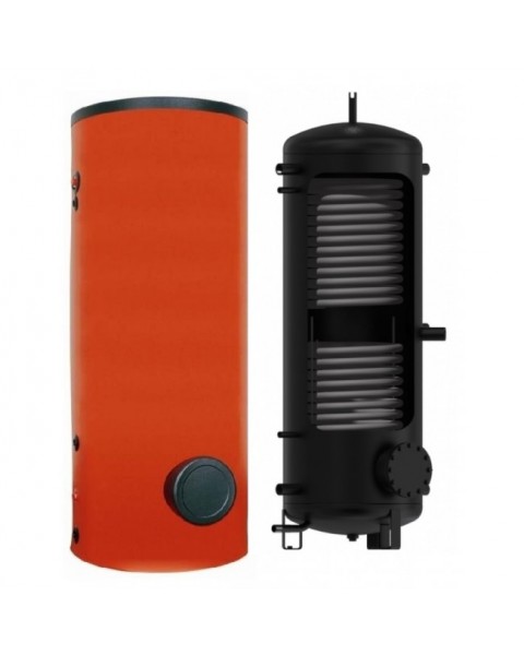 Модель NADv5 500 представляет собой цилиндрический бак вертикальной установки на твёрдом основании. Он предназначен исключительно для аккумулирования теплоносителя внутри отопительной системы и не рассчитан на хранение горячей хозяйственной воды. Корпус изготовлен из углеродистой стали, без внутренней эмалевой обработки, с наружной антикоррозионной защитой. В стандартном исполнении поставляется без теплоизоляции, что делает цену более доступной, но возможен заказ модификаций с утеплением. Конструкция включает два встроенных теплообменника, которые позволяют интегрировать дополнительные тепловые контуры.