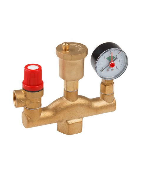 Состав изделия: предохранительный клапан (настройка - фиксированная, 3 бара), автоматический воздухоотводчик, манометр, латунный никелированный корпус. Группа безопасности котла монтируется на выходе теплогенератора.
