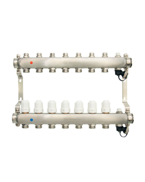 Коллектора радиаторного отопления серии VF.587.06.07изготовлены из нержавеющей стали AISI 304. Гребенка продается в собранном на заводе и уже готовом для эксплуатации виде. В комплект поставки входит два симметричных стеновых крепления, два воздухоотводчика, два сливных крана, вентили для регулировки контуров с резьбой M30. Подключение труб отопления к коллектору производится, как правило, при помощи обычных элементов типа «евроконус».
