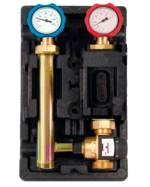 Смесительный узел оснащен ручным термостатическим клапаном, который позволяет регулировать температуру теплоносителя в контуре. Такая схема особенно востребована в системах, где требуется постоянное снижение температуры по сравнению с подачей от котла.