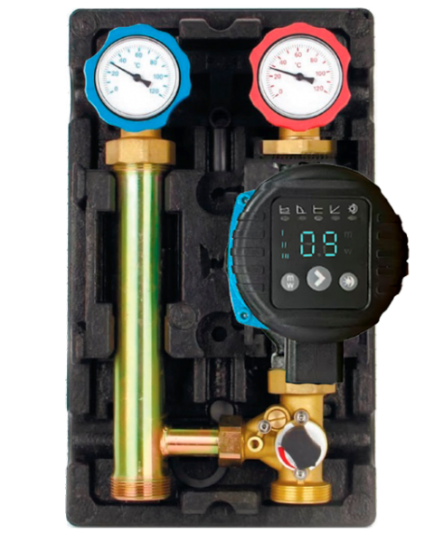 Монтажный блок объединяет элементы, необходимые для стабильной работы отопительного контура с регулировкой температуры.