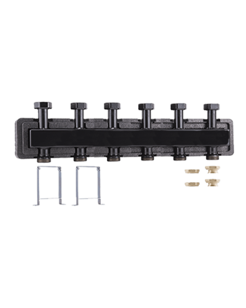 Распределительный коллектор разрабатывался специально для насосных групп Barberi. Группы могут монтироваться как сверху коллектора, так и снизу. Корпус коллектора защищен теплоизоляцией. В комплекте так же идут крепежные кронштейны, поворотные накидные гайки и фитинги для подключения насосных групп.