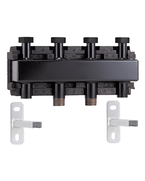 Распределительный коллектор P72025002 разрабатывался специально для компактных насосных групп Barberi DN20. Корпус коллектора защищен теплоизоляцией. В комплекте так же идут крепежные кронштейны и поворотные накидные гайки.