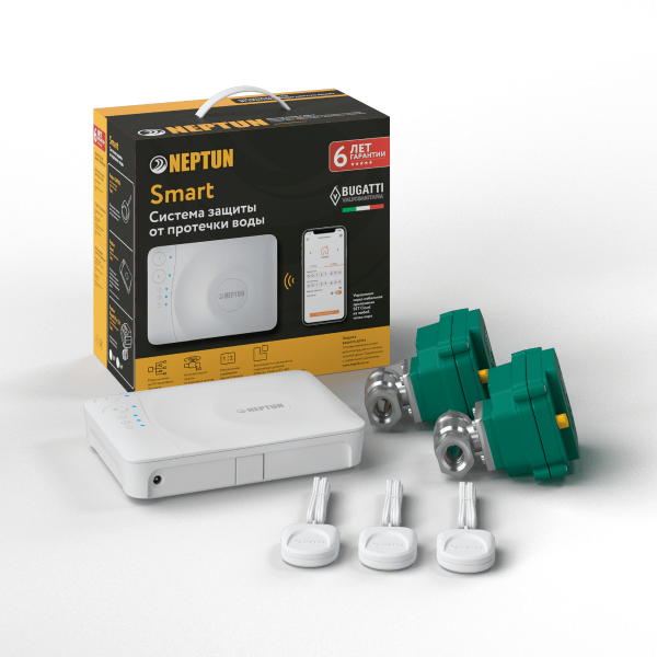 Система защиты от протечек воды Neptun Bugatti Smart 1/2 Tuya представляет собой полноценный комплект, предназначенный для автоматического обнаружения утечек и перекрытия подачи воды при аварии. Модель рассчитана на соединение с трубопроводом диаметром ½ дюйма и включает центральный контроллер, электрические шаровые краны и несколько датчиков. Управление системой осуществляется через мобильное приложение, что позволяет оперативно реагировать на аварийную ситуацию.
