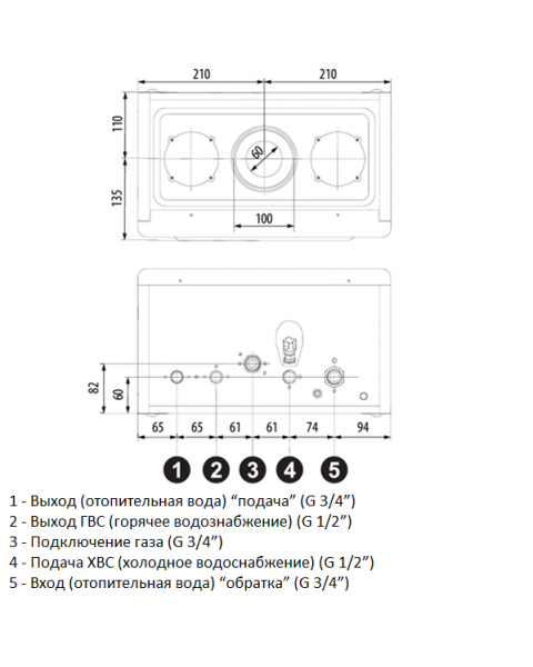 подключение коаксиального дымохода 60/100 или 80/80 мм;