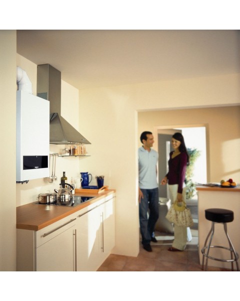 Способ отвода продуктов сгорания — турбированная схема с коаксиальным дымоходом. При правильном монтаже и настройке котёл стабилен к изменениям давления газа. Система управления допускает подключение комнаты-регулятора или автоматического управления по внешней температуре.