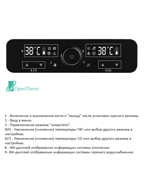 Панель управления котлом включает интерфейс для регулировки температуры в контуре отопления и горячего водоснабжения, а также систему самодиагностики, контролирующую параметры работы и сигнализирующую о возможных неполадках. Это помогает поддерживать стабильный режим работы и упрощает обслуживание.