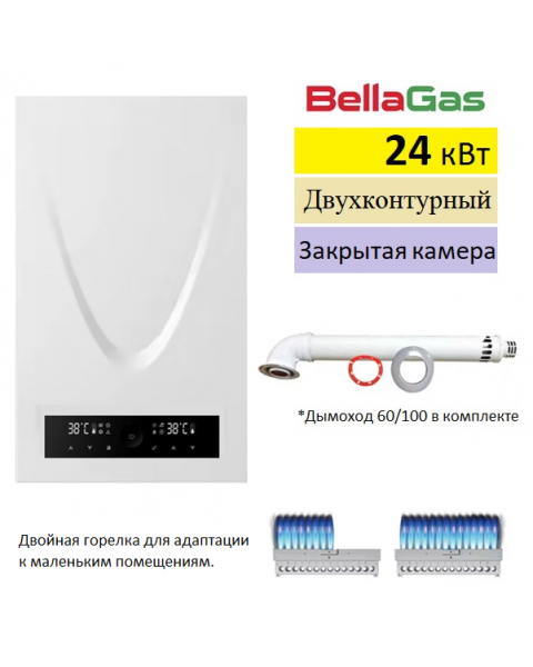 BellaGas Premium 24.2 газовый настенный котёл, мощность котла 24 кВт. Закрытая камера сгорания (турбированный), подключение дымохода 60/100 или 80/80 мм. Двухконтурный для отопления и приготовления горячей воды. Котёл сделан в Республике Беларусь. Первичный теплообменник из меди, теплообменник для гвс из пищевой нержавеющей стали Inox.