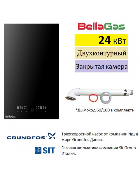 BellaGas Premium Vip 24 газовый настенный котёл, мощность котла 24 кВт. Закрытая камера сгорания (турбированный), подключение дымохода 60/100 или 80/80 мм. Двухконтурный для отопления и приготовления горячей воды. Котёл сделан в Республике Беларусь. В котле установлены запчасти Grundfos, Sit, Huba Control, Mtv gruop и другие. Первичный теплообменник из меди, теплообменник для ГВС из пищевой нержавеющей стали Inox.