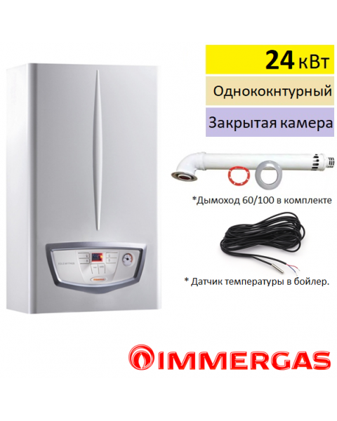 Настенный газовый котёл Immergas EOLO Mythos X 24 5R — это бытовая отопительная установка с закрытой камерой сгорания и турбированным выводом дымовых газов, предназначенная для создания комфортного микроклимата в жилых помещениях. Модель разработана с учётом европейских стандартов качества и обеспечивает стабильное отопление с возможностью подключения к системе горячего водоснабжения через внешний бойлер косвенного нагрева, что делает её гибким решением для дома или квартиры.