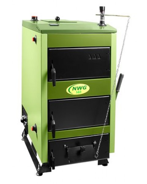 Котел САС твердотопливный серии НВГ изготовлен из котловой стали толщиной 5 мм и между внешним кожухом и водяной рубашкой закладывают минвату для того, чтобы котел не нагревался. Также на котел по заводу устанавливают ручной тягорегулятор на цепочке. Тягорегулятор регулирует температуру теплоносителя (вода, антифриз) в системе отопления. Внутри тягорегулятора используется гелий, который расширятся или сужается в зависимости от температуры теплоносителя, потому поддерживает строго заданную температуру для систем отопления. При изменении температуры тягорегулятор сам поднимает или опускает крышку, которая находится на нижней дверце котла Sas Также к твердотопливному котлу на дровах и торфобрикете SAS NWG можно подключить бойлер косвенного или комбинированного нагрева для систем ГВС.