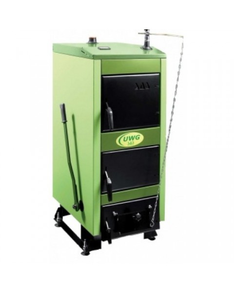 Котел САС твердотопливный серии УВГ изготовлен из котловой стали толщиной 5 мм и между внешним кожухом и водяной рубашкой закладывают минвату для того, чтобы котел не нагревался. Также на котел по заводу устанавливают ручной тягорегулятор на цепочке. Тягорегулятор регулирует температуру теплоносителя (вода, антифриз) в системе отопления. Внутри тягорегулятора используется гелий, который расширятся или сужается в зависимости от температуры теплоносителя, потому поддерживает строго заданную температуру для систем отопления. При изменении температуры тягорегулятор сам поднимает или опускает крышку, которая находится на нижней дверце котла Sas Также к твердотопливному котлу на дровах и торфобрикете SAS UWG можно подключить бойлер косвенного или комбинированного нагрева для систем ГВС.