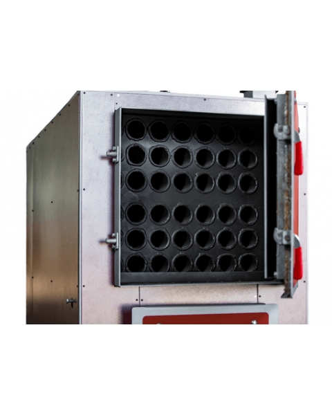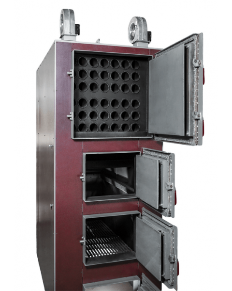 Котел рассчитан на систему с принудительной циркуляцией теплоносителя. Дверцы камеры сгорания и зольника обеспечивают быстрый доступ к внутренним элементам для чистки и технического обслуживания. Автоматизированная система управления подбирает наддув под текущую нагрузку, что продлевает интервалы загрузки топлива и снижает необходимость ручного вмешательства.