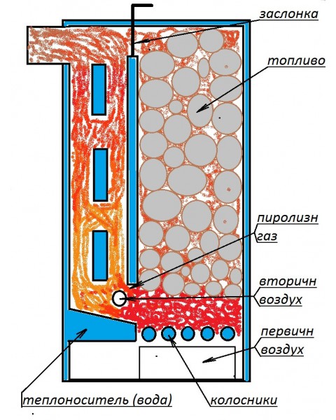 Котел Татра КТ15-НЛ1 состоит из двух основных частей ? камера сгорания и теплообменника. Камера сгорания или, вернее, топка в пиролизных котлах состоит из двух секций: зона загрузки и зона сгорания. В первой части (загрузки) топливо сгорает медленно и пиролизуется, образовывая при этом газы, которые в зоне сгорания (второй) под воздействием вторичного воздуха разгораются, выделяя основное тепло для нагрева воды в контуре. По своей сути пиролизные котлы являются экономическими так как в нем сгорают все составляющие топлива. Помимо этого, процесс горения происходит в течении от 12 часов до 30 часов, в зависимости от способа подачи воздуха.