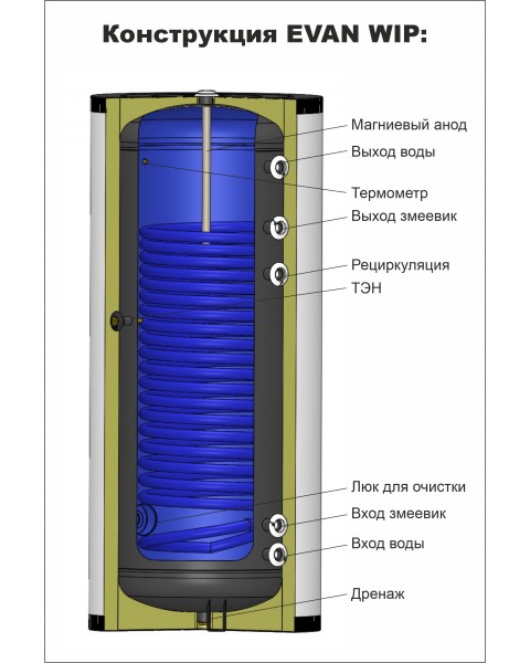 Бойлер косвенного нагрева EVAN WIP-HT-200 используется для организации горячего водоснабжения с геотермальными и воздушными тепловыми насосами в жилых и загородных частных домах, а также других бытовых и хозяйственных объектах. Модель оснащена внутренним баком, спиральным теплообменником, резьбовыми штуцерами для подключения теплового насоса к контуру теплообменника, подвода холодной и выхода горячей воды и защитной крышкой. Бак выполнен из стали с внутренним эмалированным покрытием, соответствующим стандарту DIN 4753, теплоизоляция – из полиуретана.