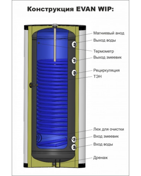 Бойлер косвенного нагрева EVAN WIP-HT-500 используется для организации горячего водоснабжения с геотермальными и воздушными тепловыми насосами в жилых и загородных частных домах, а также других бытовых и хозяйственных объектах. Модель оснащена внутренним баком, спиральным теплообменником, резьбовыми штуцерами для подключения теплового насоса к контуру теплообменника, подвода холодной и выхода горячей воды и защитной крышкой. Бак выполнен из стали с внутренним эмалированным покрытием, соответствующим стандарту DIN 4753, теплоизоляция – из полиуретана.