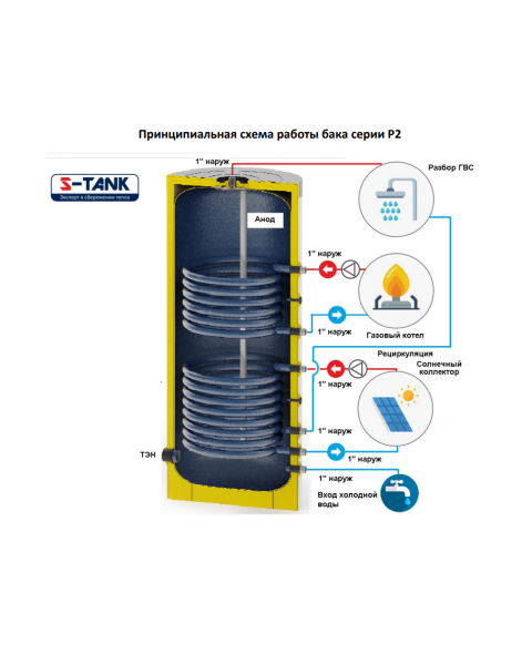 Бойлер косвенного нагрева S-TANK P2 1500 предназначен для аккумулирования горячей воды от различных источников тепла. Бак серии «Р2» улучшает гибкость системы ГВС, позволяя вам аккумулировать постоянный объем горячей воды, использовать рециркуляцию ГВС для повышения комфорта пользования. А возможность подключения ТЭНа в отверстие в нижней части бака, делает бак более универсальным.