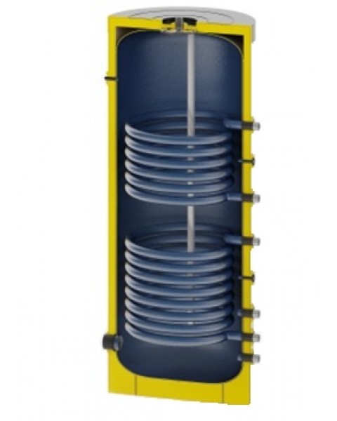 Эмалированный бак косвенного нагрева с двумя мощными теплообменниками, с рециркуляцией, гильзой под датчик температуры и термометр. С ревизионным фланцем и отверстием в 1 1/2" (до 500 л вкл) и 2" (750 и 1000 л) под установку ТЭНа. Магниевый анод в комплекте.