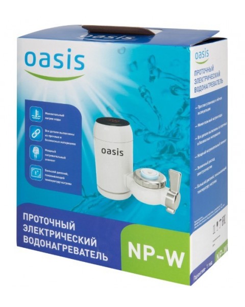 Электрический проточный водонагреватель Oasis NP-W — компактное решение для мгновенного подогрева воды прямо у точки отбора. Устройство монтируется непосредственно на излив смесителя и запускается при открытии крана, что обеспечивает горячую воду без накопительной ёмкости.